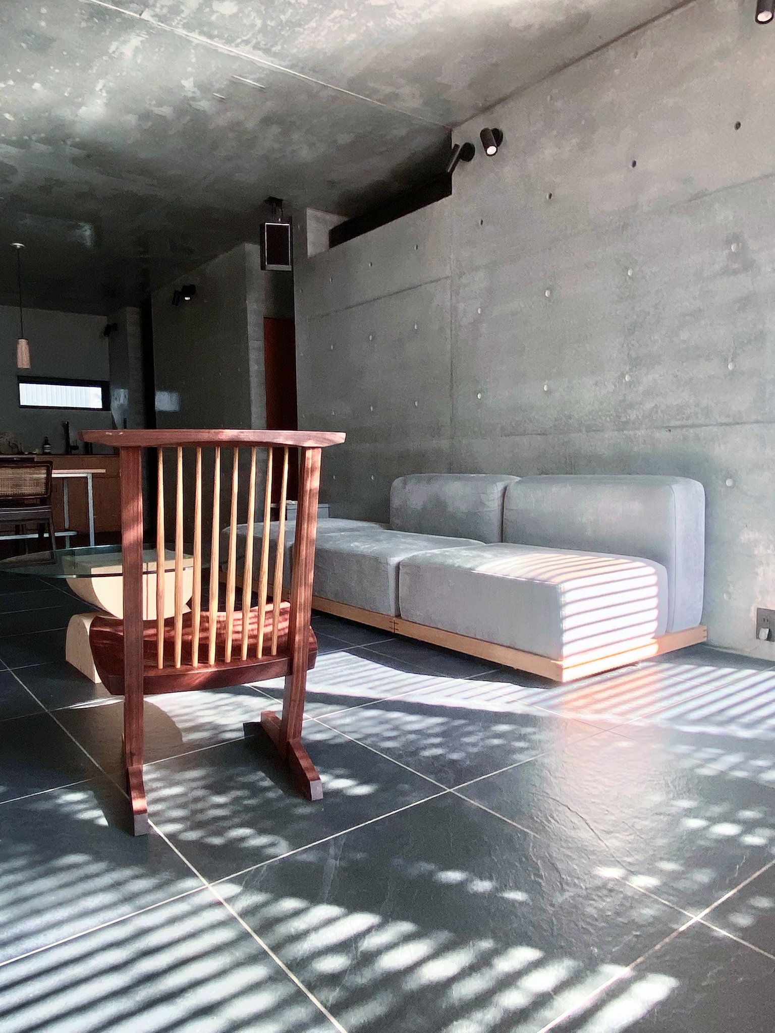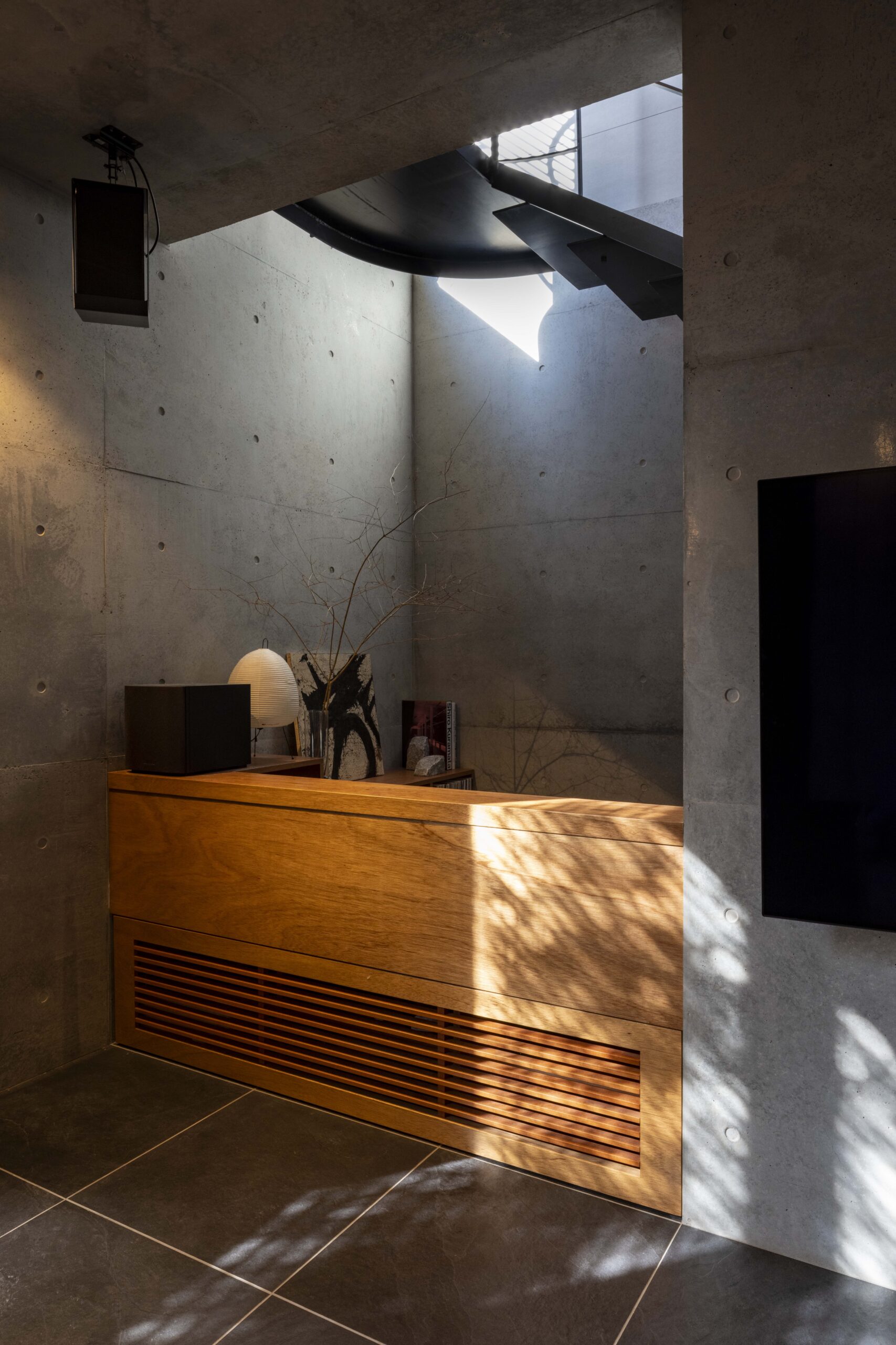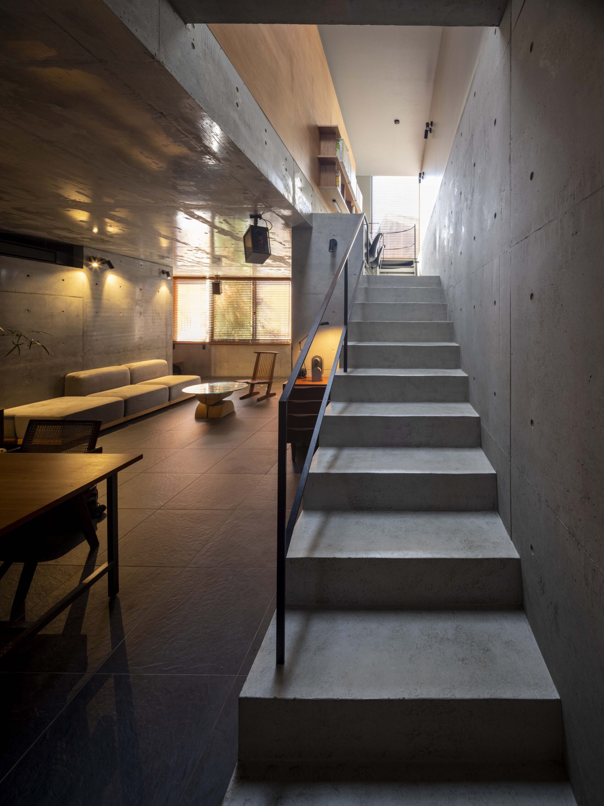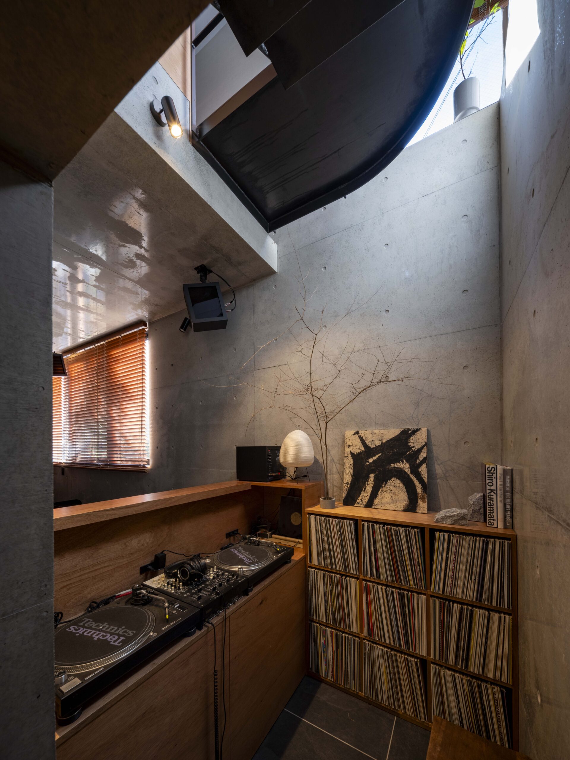 DJを趣味とする、音楽が大好きな夫婦のための住宅です。三方囲まれた奥行き11メートルのアプローチを持つ旗竿敷地ですが、伸びやかでゆったりとした空間をつくることを目指しました。主室であるリビングダイニングのある1階は、近隣への音響対策とできる限り広々としたワンルームを確保するため、壁式鉄筋コンクリート造を採用。打ち放し仕上げにしています。そして1階、緩い階段、中2階を吹き抜けがつなぎ、立体的なワンルーム空間を構成しています。またこの住宅は断熱性や気密性などに配慮し、再生可能エネルギーも創出するなど、ZHE(ネット・ゼロ・エネルギー・ハウス)基準を満たしています。