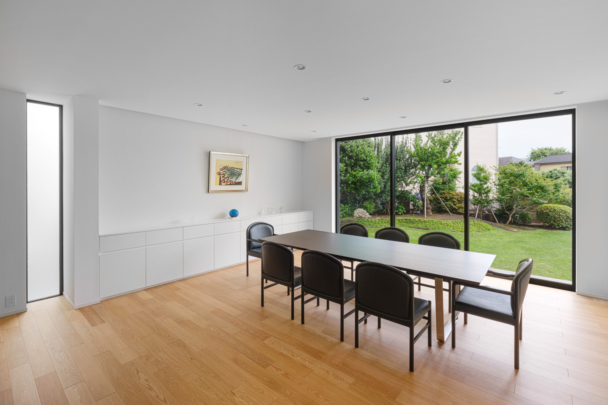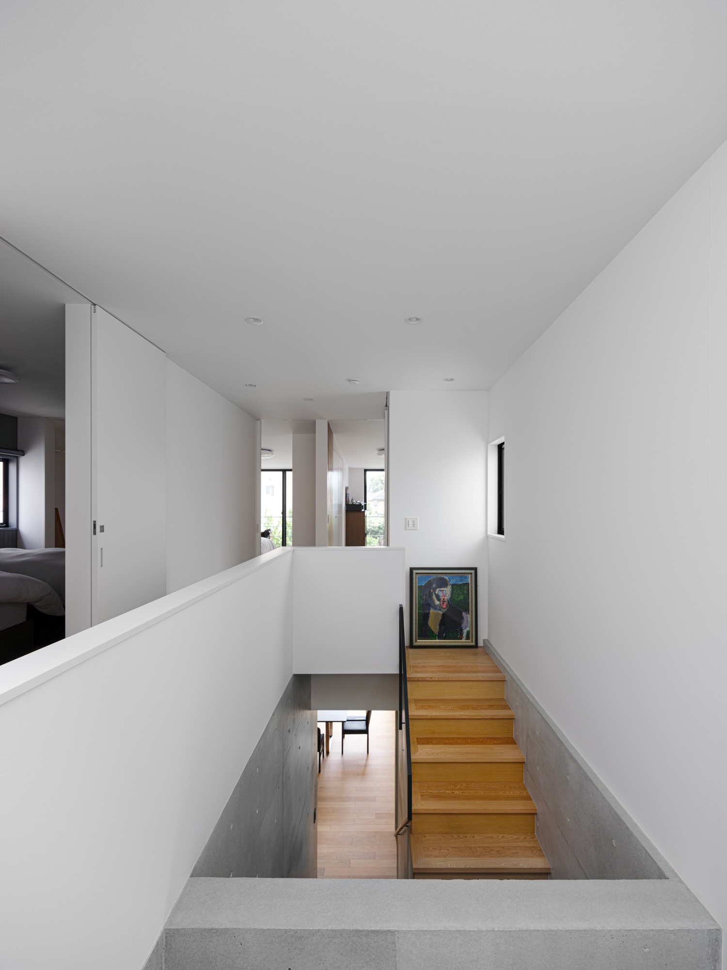 プライバシーを確保しながらも明るく開放的な空間をつくりたいという建て主の要望を実践した住宅です。都心部でありながら南側にある母屋の広い庭を共有する敷地で、庭と建物の関係性も熟考しながらプランニングしました。1階の南側に大きく開口部を設けることで、庭の風景と自然光を最大限に取り込んでいます。幹線道路に面した北側の玄関は吹き抜けにして大きな天窓を設けることで、プライバシーは確保しつつ1階まで自然光が降り注ぐ、明るい空間が生まれました。室内は打放し仕上げの構造壁をそのまま生かし白色を混ぜた保護塗料を使用、コンクリートの質感をのこしながら明るく仕上げています。