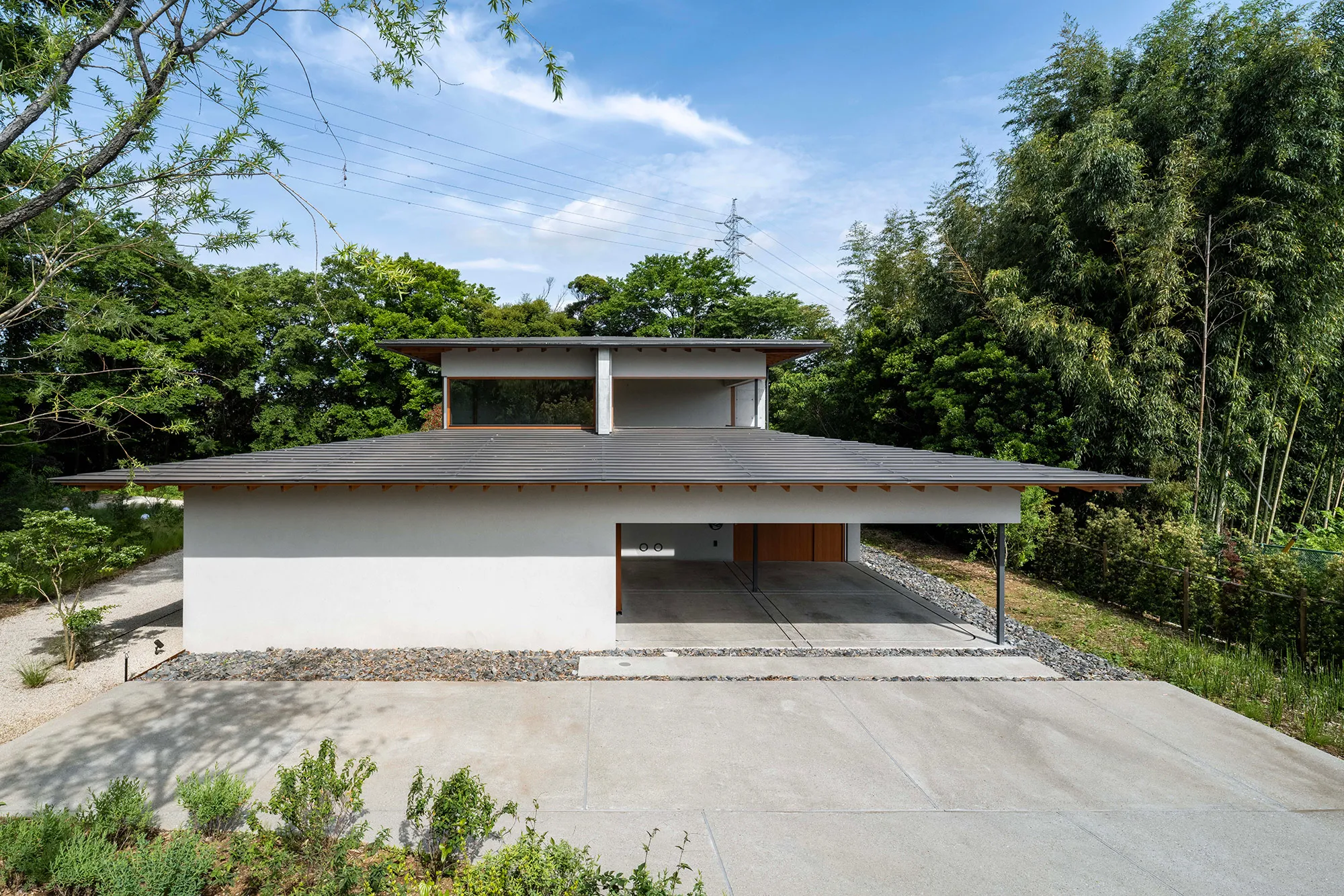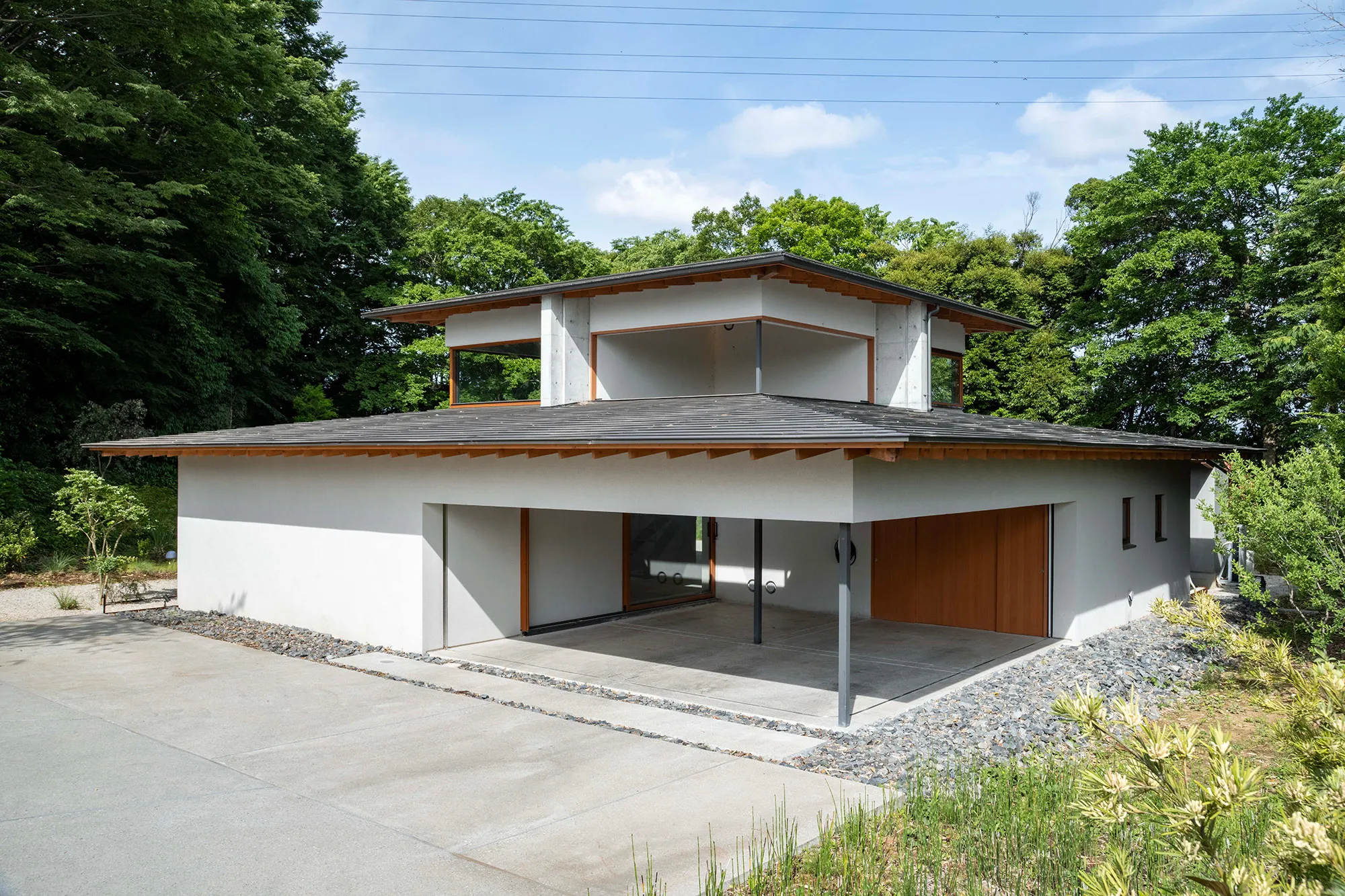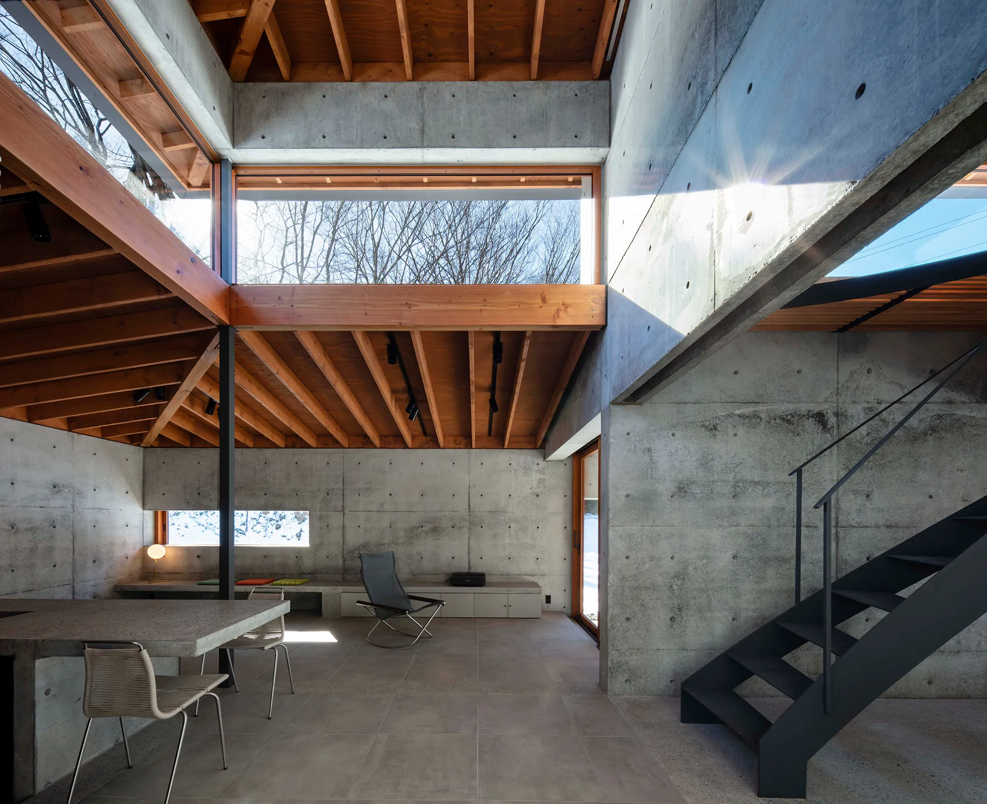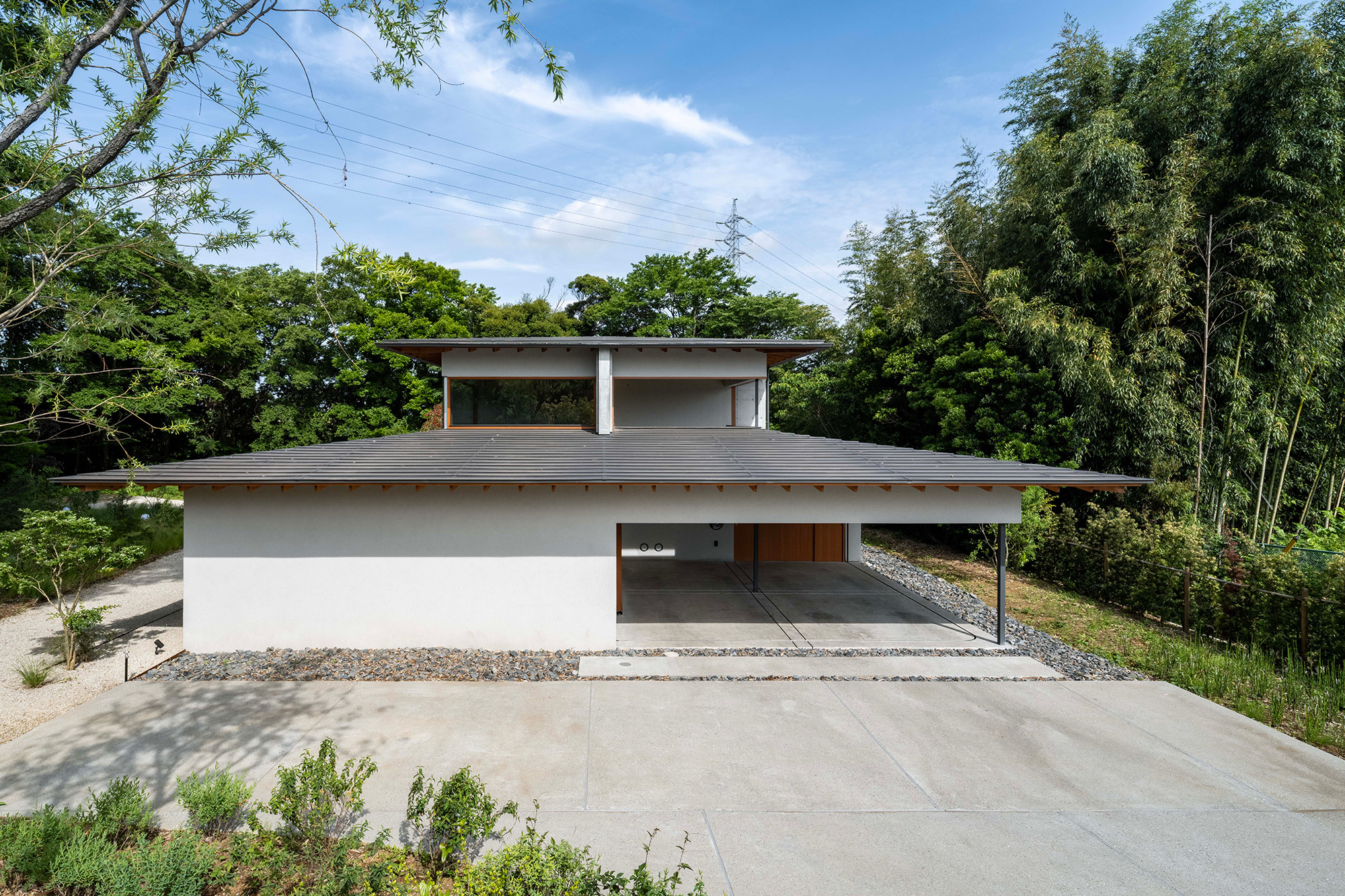 緑に囲まれた環境で、日常生活でもアウトドアを楽しみたいという建て主の希望をかたちにした住宅です。低い軒と緩やかな屋根が、外部からの視線は遮りながらも室内と庭をつなげています。また、テラスとアトリエという半外部空間が仲介することで、住まいと豊かな自然が一体化することに一役買っています。周辺の高木が日光を遮ってしまうのですが、上階のハイサイドライトや吹き抜けを設けることで光を室内に取り込むと同時に、そこからも木々や青空が眺められ、どこにいても自然を感じられる空間になっています。