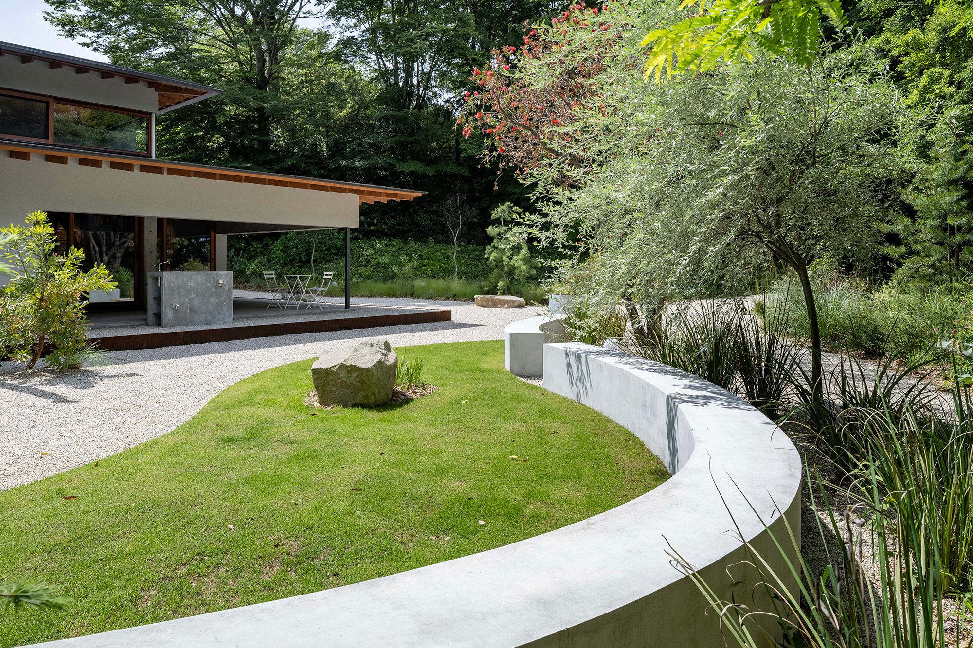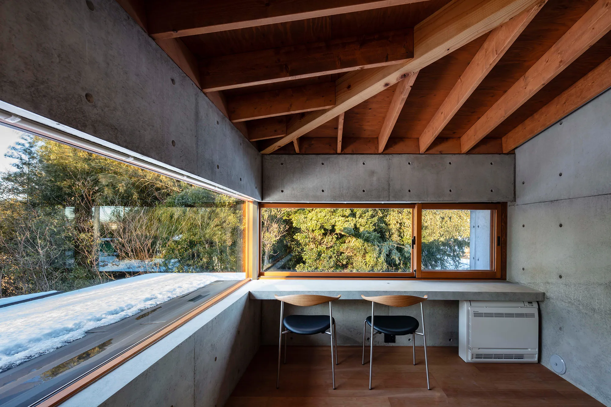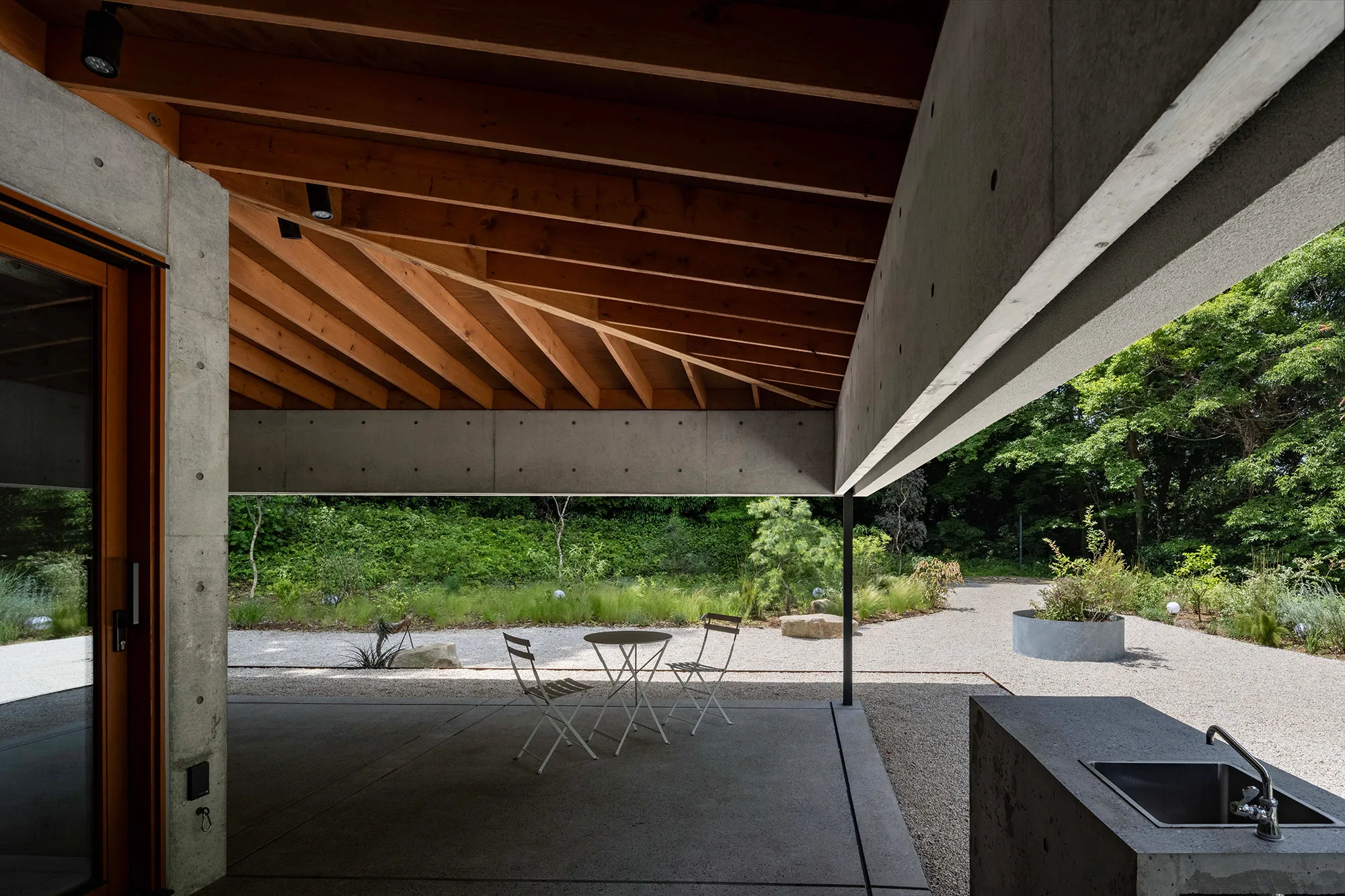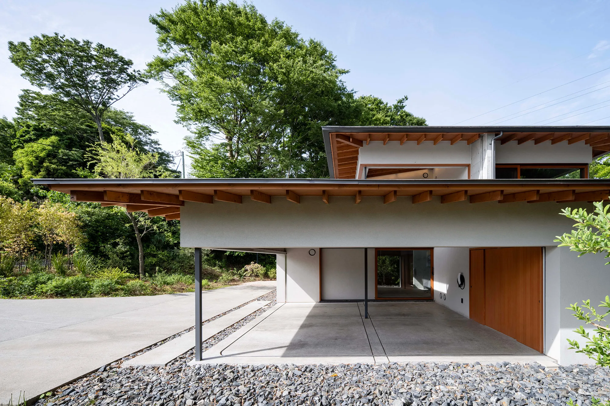 緑に囲まれた環境で、日常生活でもアウトドアを楽しみたいという建て主の希望をかたちにした住宅です。低い軒と緩やかな屋根が、外部からの視線は遮りながらも室内と庭をつなげています。また、テラスとアトリエという半外部空間が仲介することで、住まいと豊かな自然が一体化することに一役買っています。周辺の高木が日光を遮ってしまうのですが、上階のハイサイドライトや吹き抜けを設けることで光を室内に取り込むと同時に、そこからも木々や青空が眺められ、どこにいても自然を感じられる空間になっています。