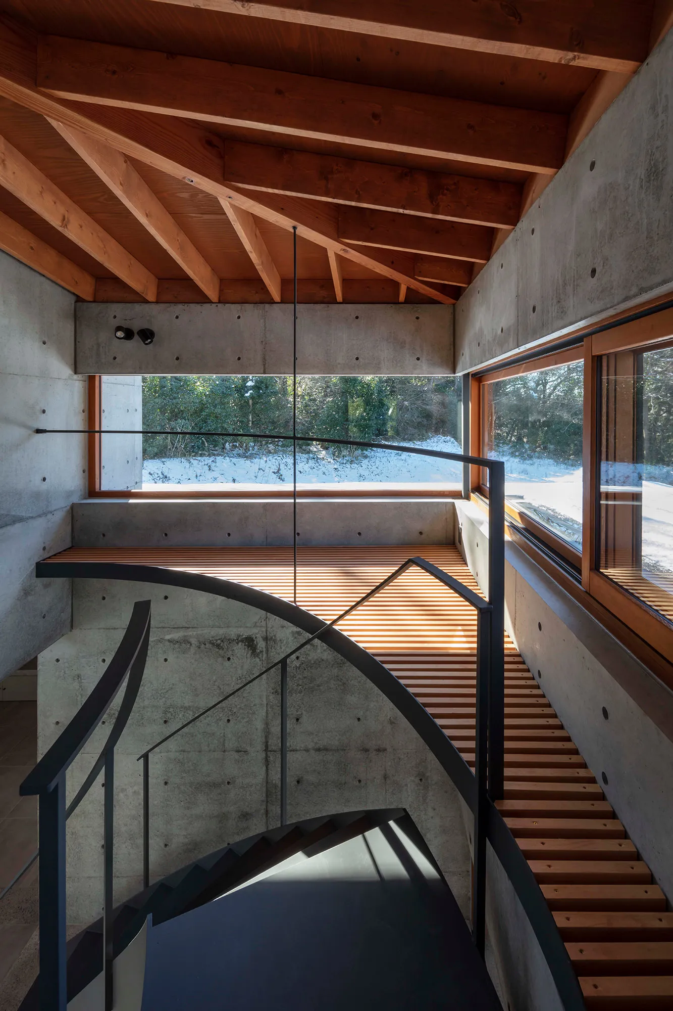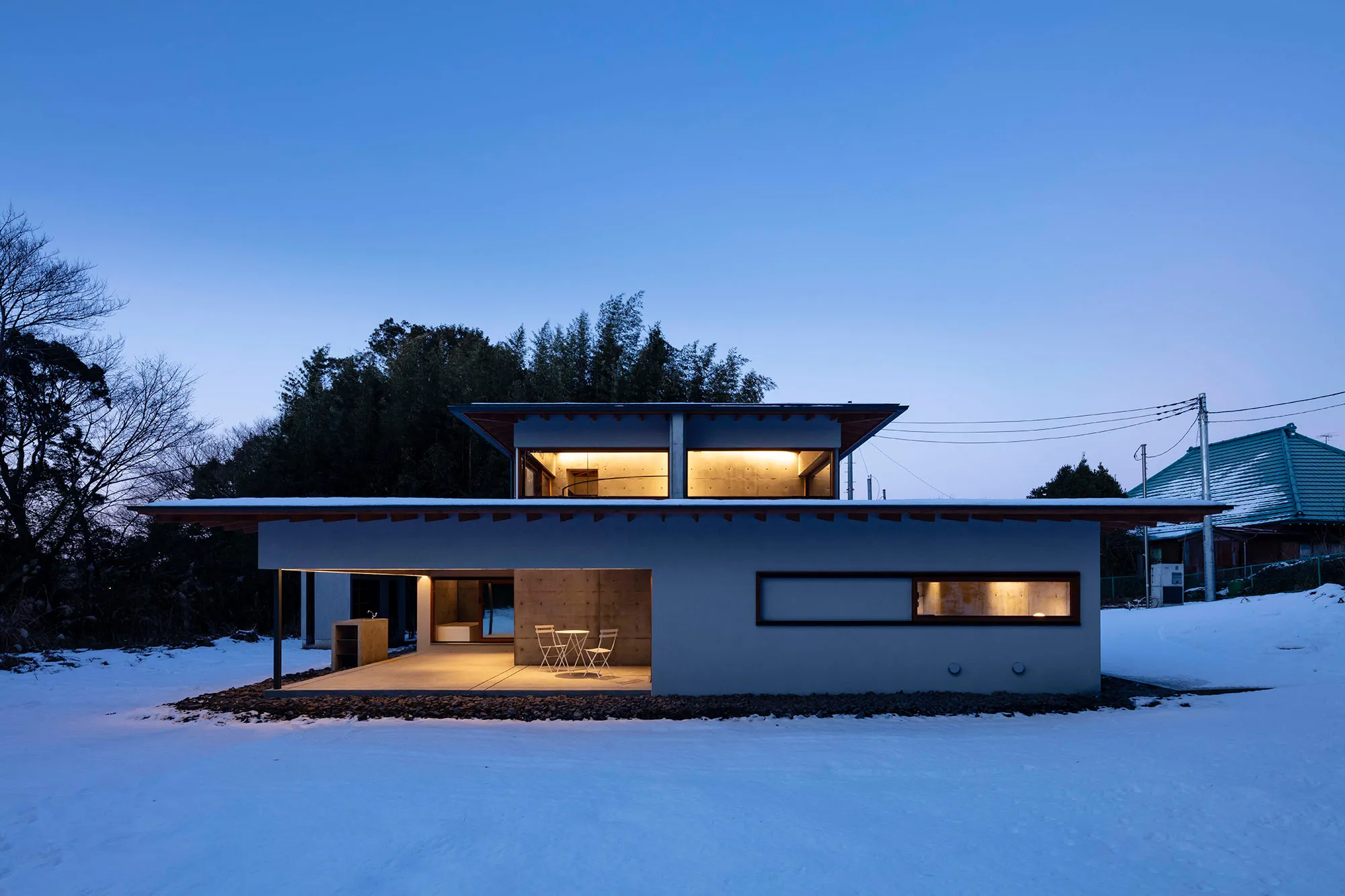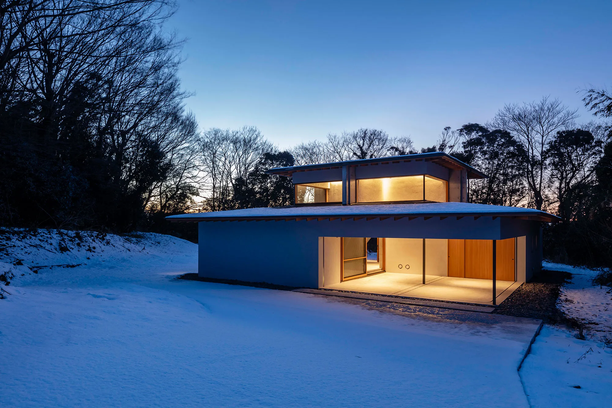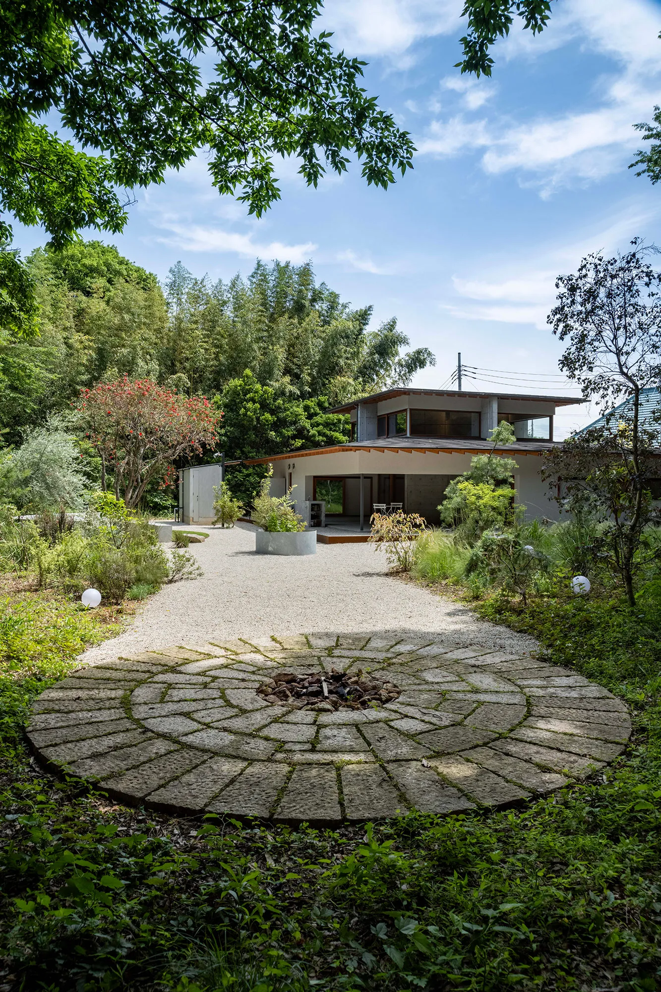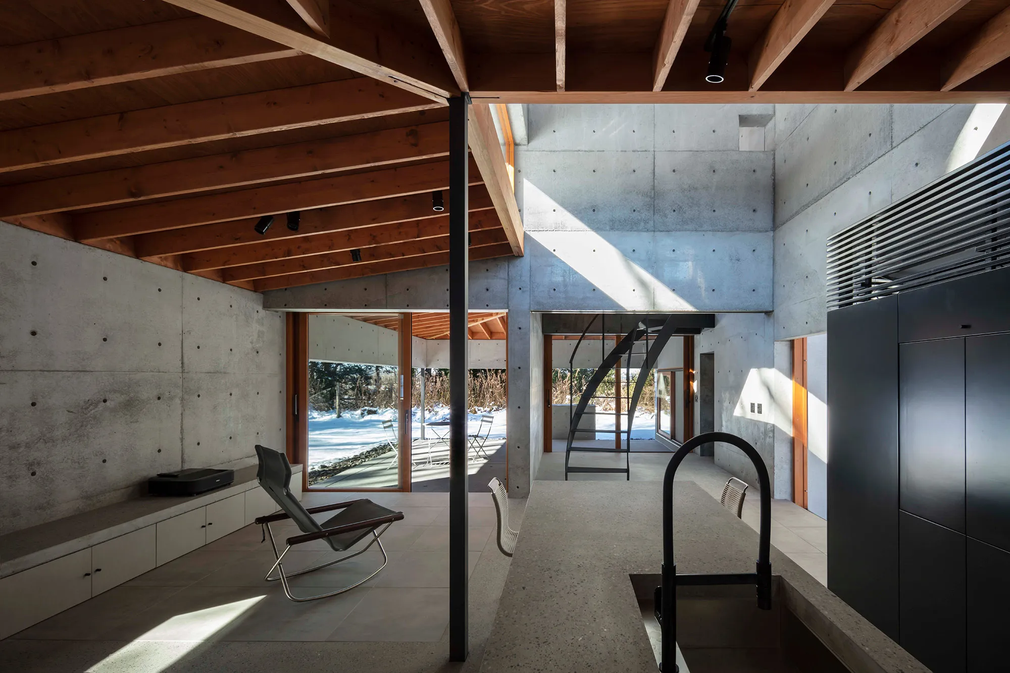 緑に囲まれた環境で、日常生活でもアウトドアを楽しみたいという建て主の希望をかたちにした住宅です。低い軒と緩やかな屋根が、外部からの視線は遮りながらも室内と庭をつなげています。また、テラスとアトリエという半外部空間が仲介することで、住まいと豊かな自然が一体化することに一役買っています。周辺の高木が日光を遮ってしまうのですが、上階のハイサイドライトや吹き抜けを設けることで光を室内に取り込むと同時に、そこからも木々や青空が眺められ、どこにいても自然を感じられる空間になっています。