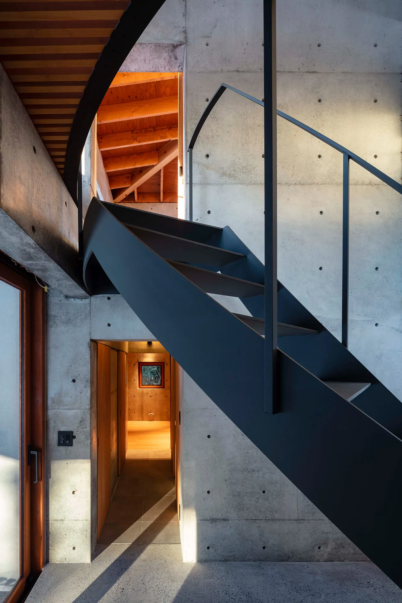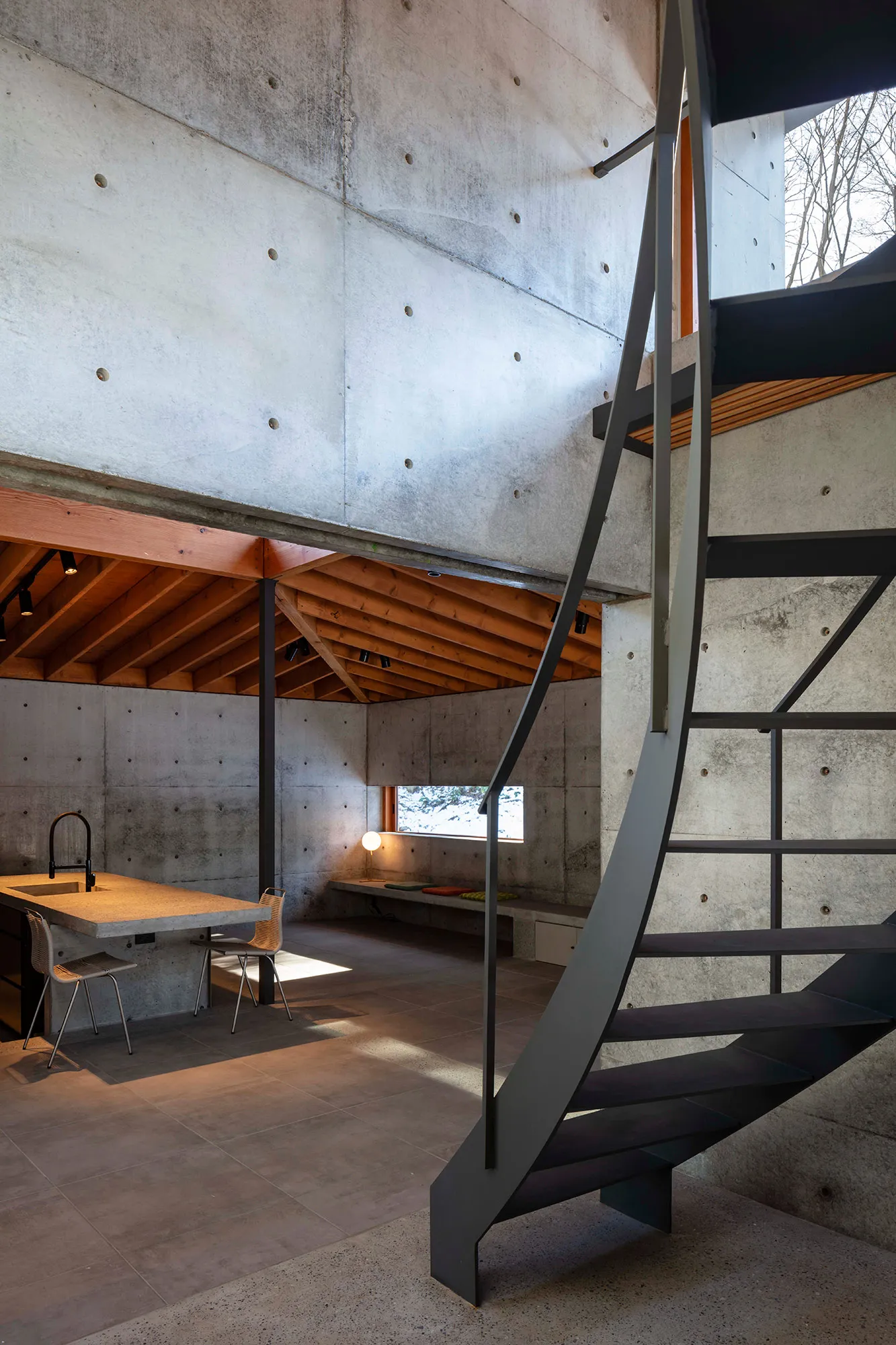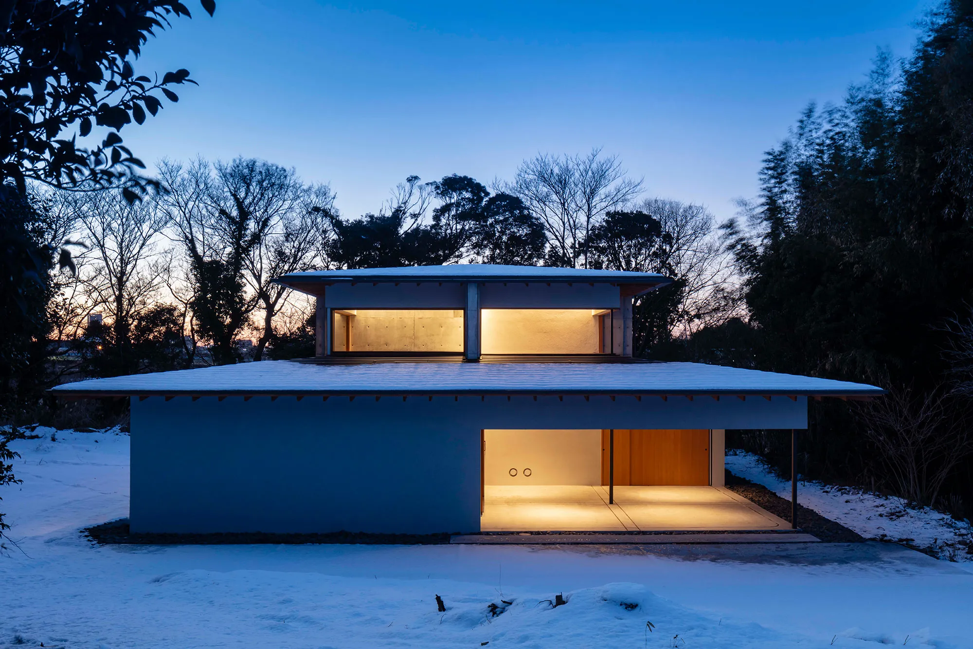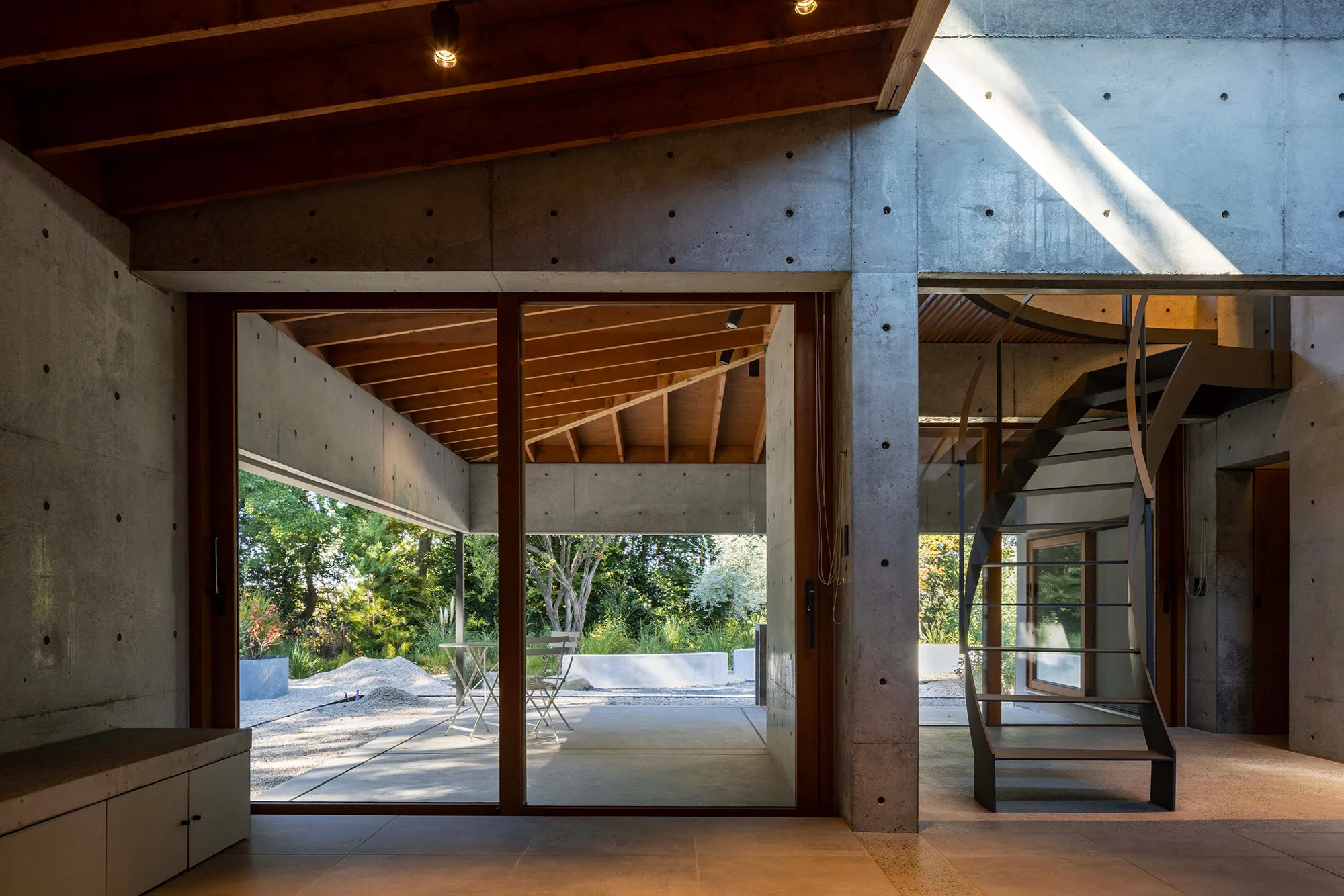 緑に囲まれた環境で、日常生活でもアウトドアを楽しみたいという建て主の希望をかたちにした住宅です。低い軒と緩やかな屋根が、外部からの視線は遮りながらも室内と庭をつなげています。また、テラスとアトリエという半外部空間が仲介することで、住まいと豊かな自然が一体化することに一役買っています。周辺の高木が日光を遮ってしまうのですが、上階のハイサイドライトや吹き抜けを設けることで光を室内に取り込むと同時に、そこからも木々や青空が眺められ、どこにいても自然を感じられる空間になっています。
